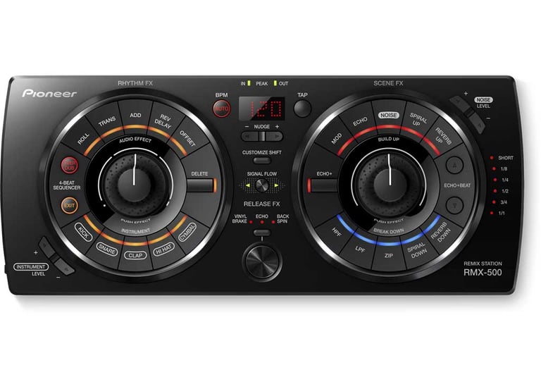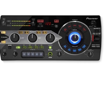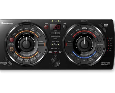 El RMX-500 tiene cinco botones para muestras de percusión, cinco Audio FX y diez Scene FX al alcance de los dedos del DJ.
